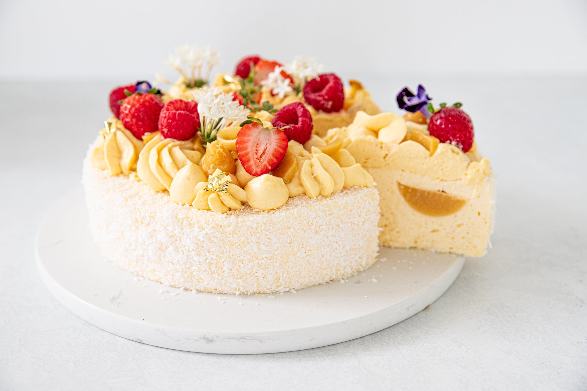 Raspberry cheese cake- Lime cheesecake, raspberry insert topped with a raspberry whipped cream. Gluten Free.